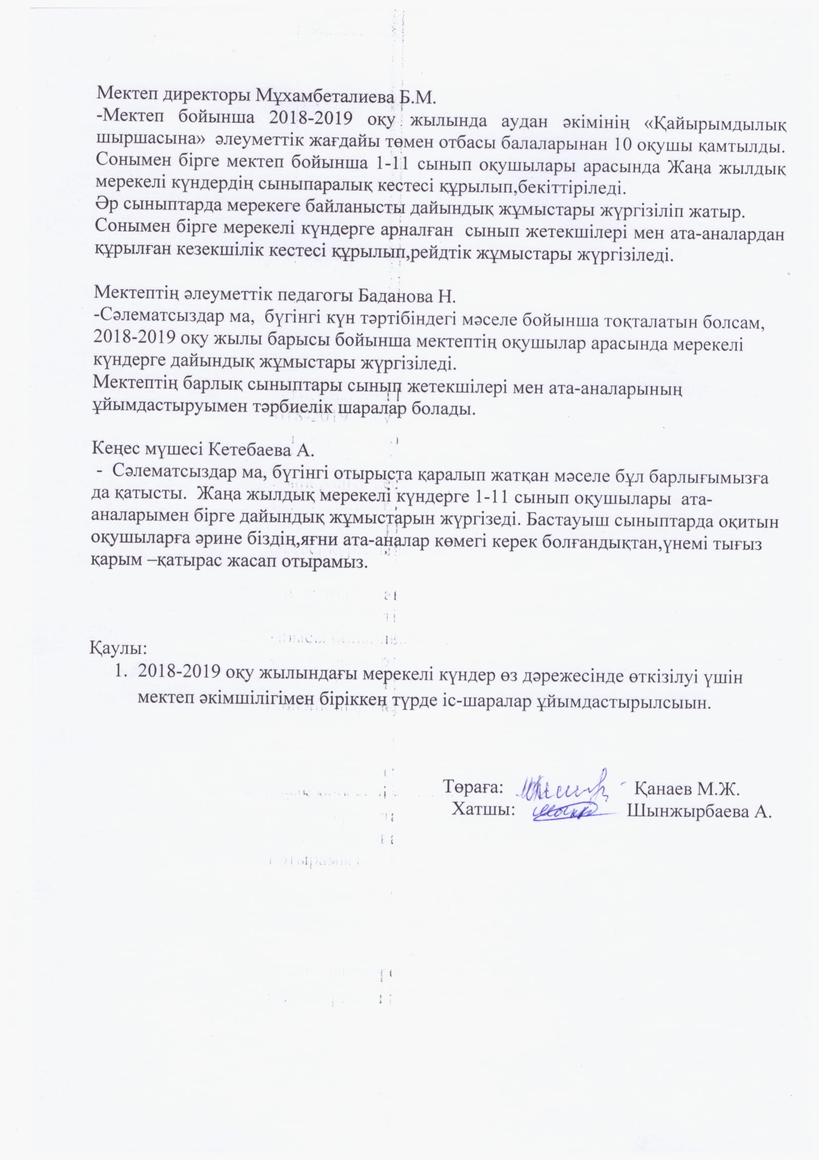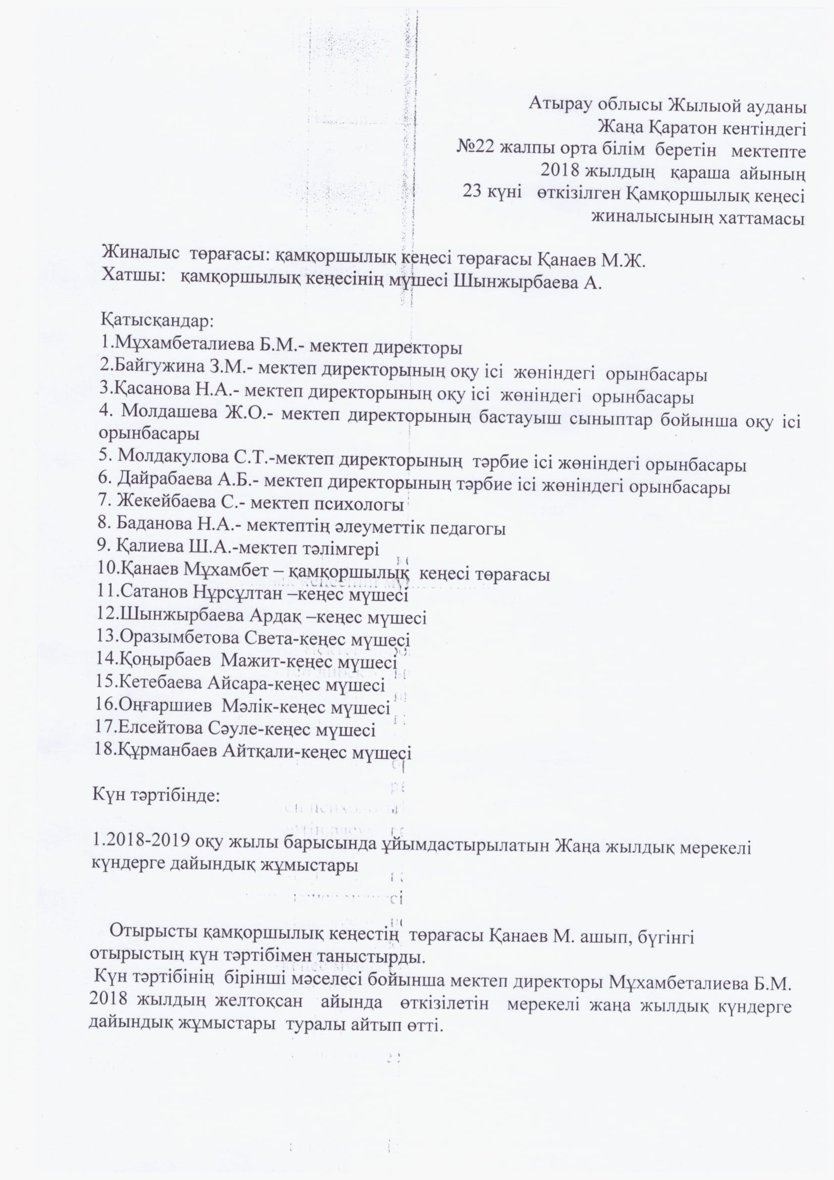 Атырау облысы Жылыой ауданы Жаңа Қаратон кентіндегі №22 жалпы орта білім беретін мектепте 2018 жылдың қараша айының 23 күні өткізілген Қамқоршылық кеңесі жиналысының хаттамасы